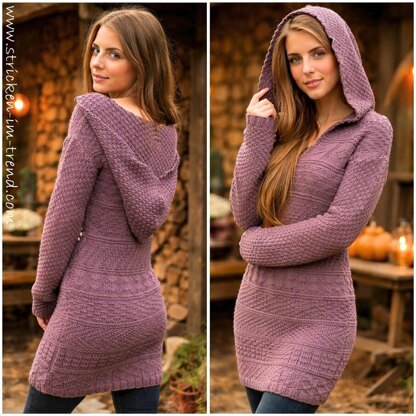 Sculptural textured stitch panels flow harmoniously across the garment, creating depth and shaping a feminine silhouette without restricting movement. The integrated hood adds a sporty yet elegant finish, making the design versatile as a hooded knit dress or long textured pullover.