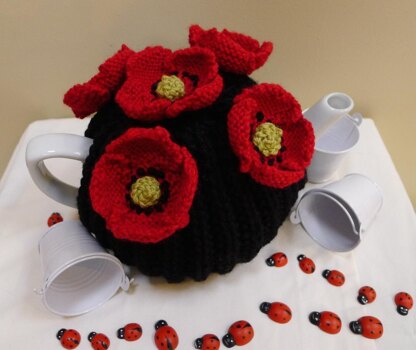 This striking black tea cosy is adorned with beautiful knitted poppies making a great contrast on top of the cosy. It would look wonderful with a simple white tea service. If you wanted to go all out you could cover the whole cosy in knitted poppies but bear in mind that you would need extra yarn.