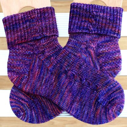 Reston Station socks feature a reversible cable, so the socks may be worn equally well with the cuff turned down to make ankle socks or with the cuff up. Reversible cables are achieved by working them in ribbing, rather than using a stitch that differs on each side.