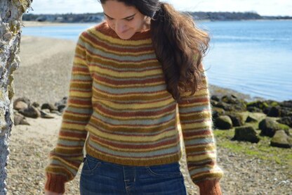 Retro Fuzz is a simple pattern that is perfect for those times when you need some good mindless knitting! This fuzzy, mohair sweater features different widths of colored stripes in a vintage-inspired palette. Knit from the top down in the round, this pullover requires no seaming and makes a great beginner garment project. The combination of wide sleeves that cinch in at the cuff and a slightly cropped body make for a great layering piece! Knit up in Knitting for Olive’s Soft Silk Mohair yarn, held double throughout, the fabric is light, fluffy and fuzzy!