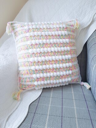 Bring a cosy and warm vibe to your room while adding a bit of style with this reversible crochet cushion. Why not change up the colour to fit your scheme or go wild with your favourite yarn. The bobbled texture and the corner tassels really it it that fun factor that we all want from our crochet makes!