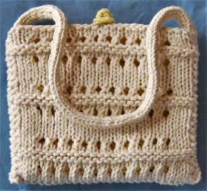 This reversible bag and clutch has a delightful look with yarn overs forming eyelets and carefully placed ridges offsetting them. The sequence of eyelets and ridges vary for each color section--allowing the contrasting color to show through each eyelet when sections are tucked in to form the reversible feature. Side edges are finished off with seed stitches, and both versions are secured with a bobble and clasp loop closure. A strap is added to the bag. The clutch uses the same pattern as the bag, does away with the strap, and is worked with smaller needles and finer yarn. Both are versatile and the possible color variations make for one-of-a-kind treasures.
