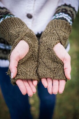 The design of these mitts takes advantage of the nature of cables. The thumb opening is an open diamond between 2 cable crossings. The cable crossings are opposite for each mitt just like your hands are mirror images of each other. Turning the mitts inside out shows off an entirely different cable pattern. (See pics)