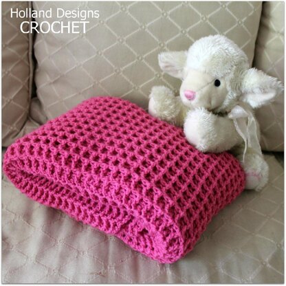 Works up quickly using any size 3 or 4 yarn. Sample was made using Anne Geddes Baby Sport weight yarn from Red Heart Yarns. Crocheted using hook size I (5.5 mm) or similar. Sample blanket was 35" square and used 4 full skeins.