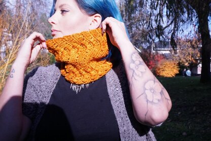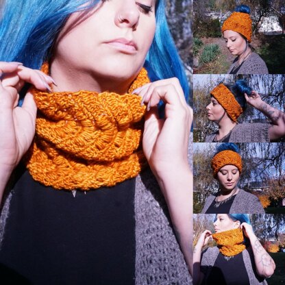 This is a cowl that features a ripple/chevron and uses puff stitches. It has beautiful texture and the size makes it so versatile. It can be worn as a cowl, fold in half for an ear warmer, or a messy bun beanie.