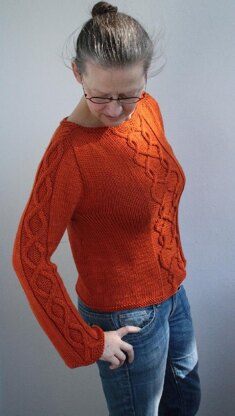 The pullover is completely seamless, knitted from top-down using the contiguous sleeve method.