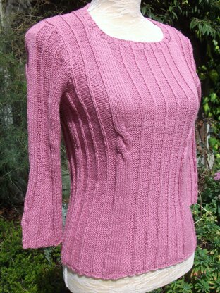 This is a really flattering shape with the wide vertical ribs and two simple strips of stocking stitch with cables worked just below the bust.