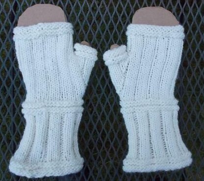 The cuffs on these warm mitts begin with purled welts that lead into a wide uneven ribbing. Another pair of welts hugs the wrist, the hand continues in ribbing, finally ending with a matching pair of purled welts.