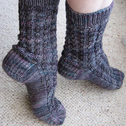 Worked cuff down and in the round, the alternating ribbed faux cables produce a snug sock with a comfortable fit.