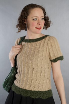 A two-tone vintage look jumper inspired by the muted Victorian palette of Rowan's Kid Classic. This jumper is soft and warm, ideal for autumn evenings. Knit bottom-up as front, back and sleeves, then seamed, it has a scalloped hem and cuffs, Richelieu rib detailing, short sleeves and a high, ribbed, rounded neckline. Worn with 1”/ 2.5cm negative ease for a flattering, curve hugging fit.