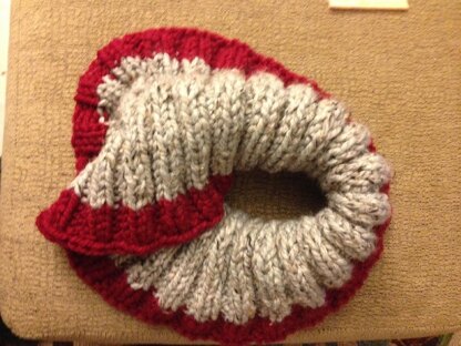 A simple ribbed knit moebius cowl. Knit on big needles with big yarn. Use a super bulky yarn and big needles 15-19 US also..it will be looser around the neck. Use Cat Bordhi's circular cast on. This pattern is marked as intermidiate but I have seen beginners make this cowl. Combine lighter weight yarns or add stripes.