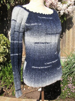 An attractive wide rib raglan sweater with a touch of waist shaping worked by needle changes. The neck is finished with a picot edge. This sweater looks great with the subtle tonal changes in this yarn which also has a touch of sparkle.