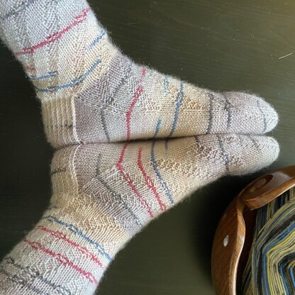 Ribbles is a charming twist on simple ribbed sock. With a shifting rib that spirals around the leg and across the top of the foot, it’s an easy, relaxing knit.