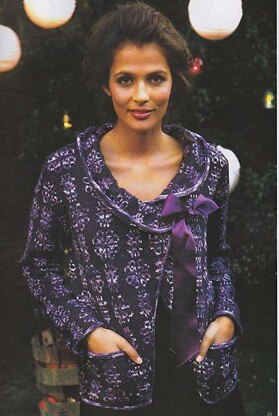 This elegant jacket features a single button closure with ribbon trim, collar, pockets, full length set in sleeves and binding to collar, sleeves, body and pocket tops. The body is worked in one piece to the armholes and then divides for fronts and back. The collar is knitted separately and the binding on all pieces is worked by picking up stitches. For this design it is recommended to weave in the contrast yarn (Yarn B) at back of work between motifs to avoid floats. The original yarn was Artesano Superwash Merino (solid shade, DK weight) and Manos del Uruguay Silk Blend. The Artesano yarn is now discontinued but Wendy Merino DK might be a suitable alternative, or try yarnsub for other suggestions. Please note that the original Manos del Uruguay yarn came in 100g skeins. Both the original and suggested alternatives are given here. Do remember to swatch especially if substituting yarn.