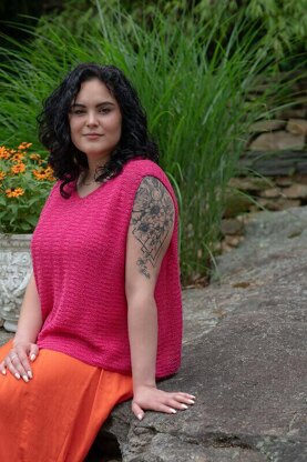The highlight of this top is the subtle ripple stitch, which creates a melodic and eye-catching texture. The stitch pattern creates a series of gentle waves that flow across the fabric, adding a touch of interest and visual appeal to the design. The stitch is executed in a bright pink yarn, making