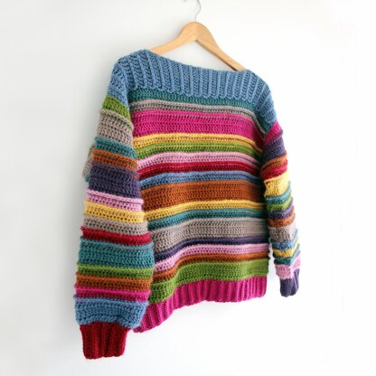 Made in luxury chunky wool, wrap yourself up in this cosy striped, drop sleeve jumper. As well as creating stripes of varying widths, the colour changes have been accentuated for added texture.