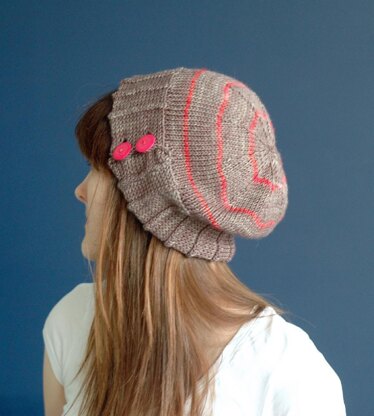 Evenly spaced welts on a sideways brim make an intriguingly textured detail, offset with pops of color in the buttons and stripes. Unique “zig zag" decreases accent the crown, creating an almost spider-webby look.
