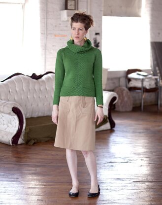 Garment is worked from the top down, beginning with the collar. Raglan is shaped then sleeve sts are held while the body is worked. Sleeve sts are picked up then worked to the cuff edge.