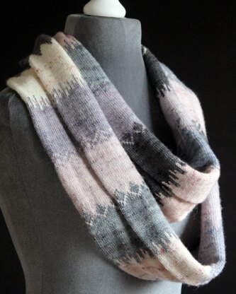 A Scots word meaning a stripe around something, Ringle is a double layered, cowl or infinity scarf. Stranded colourwork patterns mark the meeting places between the stripes adding a fun twist and interest. Ringle is perfect for using up all your leftovers, or for 20g minis. Use as few as two colours or as many as 24, or mix it up and alternate a main colour with many contrast colours.!