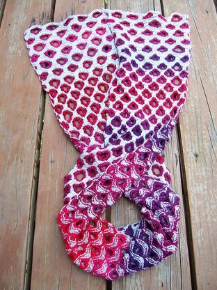 Simple non stranded colorwork scarf or wrap. Very lightweight and stretchy. For a scarf 160 cm long and 20 cm wide you will need 2 X 50 g of fingering yarn. Better use nonsplitty yarns that block well; pure wool is the best, otherwise the holes may get out of control and loose shape. As about the colors - the rings color must be in sharp contrast relative to the background, the brighter and crazier, the better!