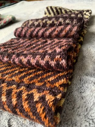 “Rise over Run” is a colorwork cowl/infinity scarf which features a geometric pattern that angles back & forth, alternating main color & contrast colors. Instructions for both a single loop cowl, worked in dk or worsted weight, and a double loop scarf, worked in fingering weight, are included. Dive into your stash & find those gorgeous soft single skeins that are waiting to be paired with a pattern that works up into a striking accessory. Both options begin with a provisional cast-on, and are worked in the round, forming a tube. The live stitches at the ends of the tube are joined together, either with a 3-needle bind-off or with Kitchener stitch, whichever is preferred. SI