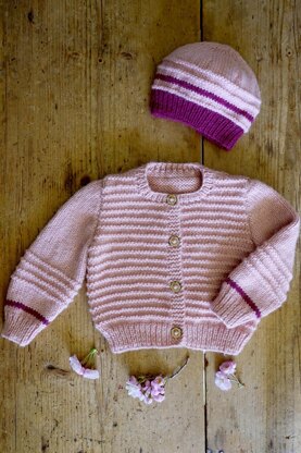 A textured stripe combination cardi and hat featuring garter stitch stripes, set in sleeves and knit as you go garter stitch front bands. Finished off with a matching Hat.