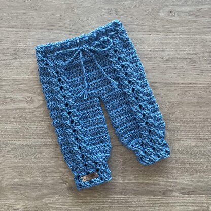 RIVER CROCHET BABY TROUSERS CROCHET PATTERN PDF - Cute cabled crochet baby pants or crochet baby joggers. Baby leggings in 3 sizes from Baby to 2 Years. Made seamless all in one so no sewing :) Unisex | Gender Neutral - Baby Boy or Baby Girl.