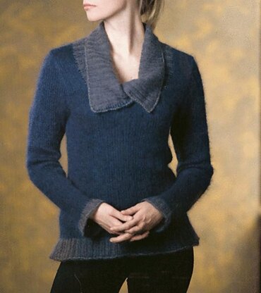 Riverbed, a mohair-silk pullover with a shawl collar, cuffs and hems worked in a coordinating color to the rest of the piece.