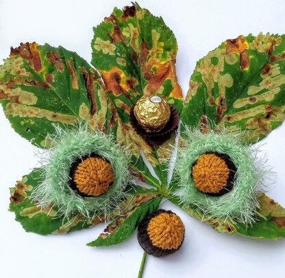 These knitted roast chestnuts really are edible as each holds a Ferrero Rocher sized chocolate! And each life-size chestnut sits snugly in its own prickly green case!