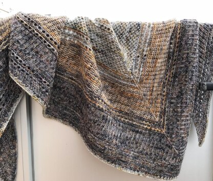 ’Rocas’ combines graphic, textural, and color interest. Named after the mineral-inspired colorways of Wol met Verve shown in the sample, this shawl is punctuated with lines of lace dots and features a lively sequence of varying stitches in different sections.