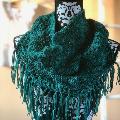 This cowl is made up of just 14 hexagons, crocheted in 4 rounds and sewn together in 2 rows. The even top border and the jagged bottom border make for unique design features. Optional fringe around just half of the bottom border finishes off the look.