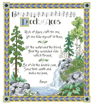 Designed by: Jorja Hernandez\nAn undeniable favorite in Christian hymnals since the late 18th century, Rock of Ages’ comforting message was written by English preacher Augustus Montague Toplady, with music by American composer Thomas Hastings. This hymn was artfully adapted to cross stitch by Kooler Design Studio designers in the 1990’s and is now available as a chart.