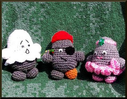 My second set of rock people in their Hallowe'en 'finery'! In this set, ballerina, pirate (complete with wooden leg) and ghost. I used sportweight yarn for the models, but feel free to use worsted, chunky or even thread and an appropriate size hook for a variety of sizes.