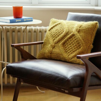 This decorative throw pillow cover features a chunky cable motif that coordinates with the Ribbon Weed throw. The cables are on the front with simple stockinette on the back. The pillow is worked flat, in one piece. The bottom of the back is worked first, followed by the cabled front and finally the top of the back. The sides are seamed, with the top of the back overlapping the bottom. Buttons add a decorative and functional finishing touch.
