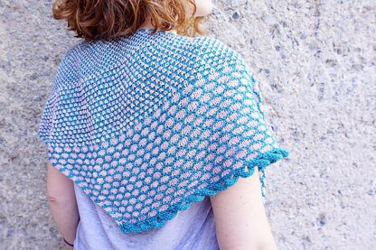 This crescent shawl is worked from the top down. Starting with a two-colored garter stitch, it’s soon transformed into an old shale pattern. By adding waves the shawl is growing asymmetrically. The edging is worked with an I-cord.