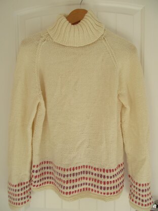 This is a pattern for a roll neck raglan jumper with a knot stitch border in two contrast colours. It was originally published in knitting magazine.