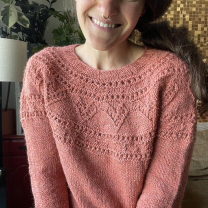 The Romantics pullover is a modern-day ski sweater for those who love love. The yoke features twisted stitch hearts sandwiched between a lace and twisted stitch pattern motif. The body is slightly cropped and tapers in at the hips in an ode to the fit of vintage ski sweaters. Knit up in The Scottish Yarn Festival’s DK yarn, a lovely wool blend base available in a variety of pretty shades, the Romantics Pullover would be the perfect design to wear on the slopes or snuggled by a fire with your significant other in the lodge!