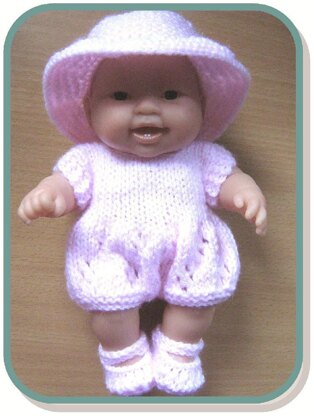Lovely outfit for the 8" chubby Berenguer doll comprising romper suit with eyelet pattern lower half and fastening with 2 buttons at the back, wide brim hat and Mary Jane style shoes. The pattern is written in UK terms.