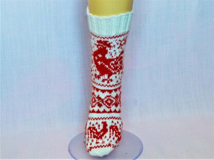 These are beautiful red and white socks with the image of roosters. You can knit them as a Christmas gift.