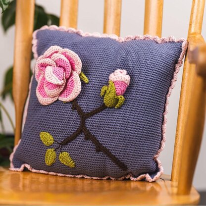 40cm Square cushion with shell edging, featuring a rose, rosebud, stem and leaves in appliqué. If using Stylecraft Special DK, you will need: 3 balls of Graphite 1 ball each of Powder Pink, Pale Rose, Meadow and Dark Brown. However, this cushion can be equally well made in many other acrylic DK weight yarns. You will also need a 4mm hook, a tapestry needle and a 40cm square cushion insert.