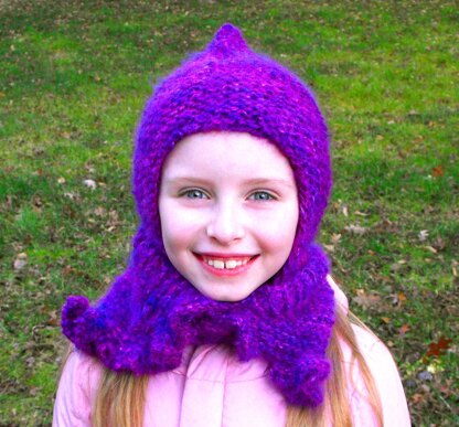 Perhaps you've seen my Linus Elf Hat (pattern available separately for download). My daughter noticed that her brother was getting a ton of positive attention everywhere we went, and she was starting to feel a bit left out, so I made her a feminine ruffled hat scarf, and now she is sharing in the positive attention. I made her hat scarf from 4 skeins of Malabrigo handspun angora, but you can use any worsted to aran weight yarn. This is a stretchy design, and it would fit a child from about 5 to about 10. I am listing the pattern (PDF, delivered by e-mail) here for sale.