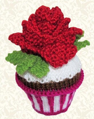 The Cupcake is knit in the round, from the bottom up. The Rose and leaves are knit flat.