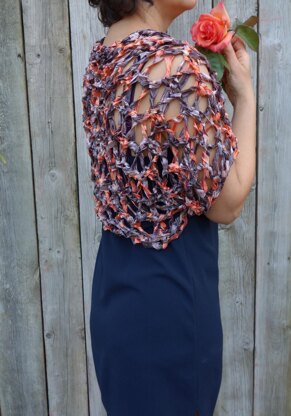 This graceful shrug is perfect to add some shoulders coverage on cool evenings. A super quick and easy project worked flat, sideways on large needles in a super chunky ribbon yarn.