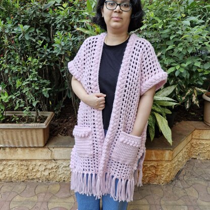 The design was inspired by early morning rose gardens — soft textures, gentle light, and tiny puff-stitch “rosebuds” blooming across the fabric. It’s elegant, feminine, and effortless. Customize your piece with pockets and fringe to create a handmade garment you’ll reach for again and again.