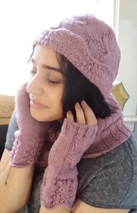 These fingerless mitts are part of The Rosebuds & Lace Suite, which consists of matching hat, cowl, and fingerless mitts.