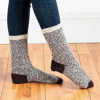 Knitted from the top down, a narrow light-colored cuff leads into an easy-to-remember striped slip-stitch leg design. Both the short-row heel and the classic toe are worked in the dark color to add a touch of the sensible.
