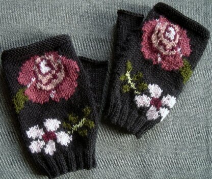 PDF knitting pattern for a pair of fingerless mitts/gloves with roses on the front of each mitt. The backs of the mitts are plain.