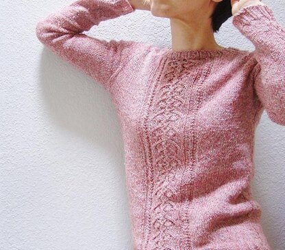 Rosetta is worked from the top-down with raglan construction seamlessly. It features the delicate lace in the front, the cute lace on the back and the sleeves. The body is worked straight with no shaping for a relaxed and laid back fit. This simple pullover with a feminine touch can be easily modified, e.g., shorter sleeves, shorter body, waist shaping, etc.