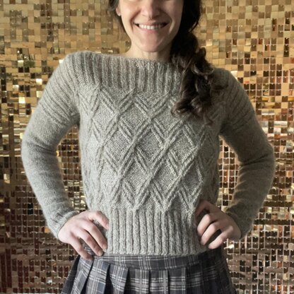 Rosie Belle is an easy to wear, classic sweater with a modern feel. The front features an allover twisted stitch and cable diamond motif sandwiched between thick bands of ribbing above and below it. The body fit, with fitted sleeves and open boat neckline, makes for a sweater that is perfect for layering and mixing and matching in your wardrobe. Rosie Belle was knit up in a very special limited edition farm yarn from Renninger Wool which has a lovely subtle fuzzy halo to the fabric.