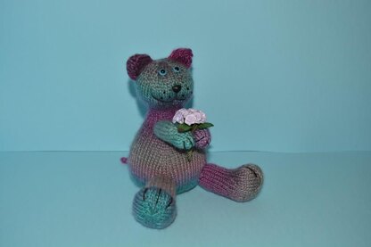 Materials needed: 3.25 or 3 US knitting needles, 40g double knit yarn, stuffing, black embroidery thread, 8mm blue safety eyes, 12mm black safety nose, 12 fake lilac roses on wire stalks, and 3 fake leaves on wire stalks